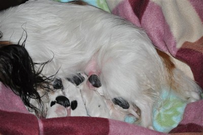 Lyckliga mamma Nova låg så lugnt och fint i sin valplåda efter en lättsam förlossning och var så stolt över hennes och pappa Perris söta små flickebarn