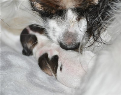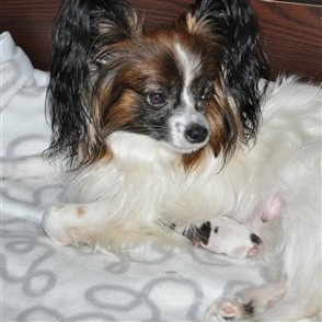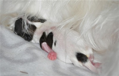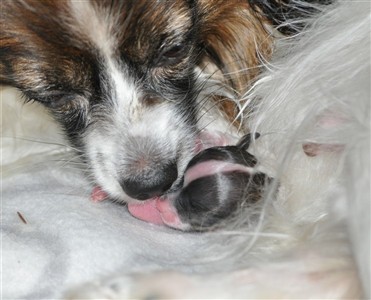 Kl. 15,50 blev hon lite orolig och vi gick in i valplådan och 10 minuter senare födde hon en liten son.